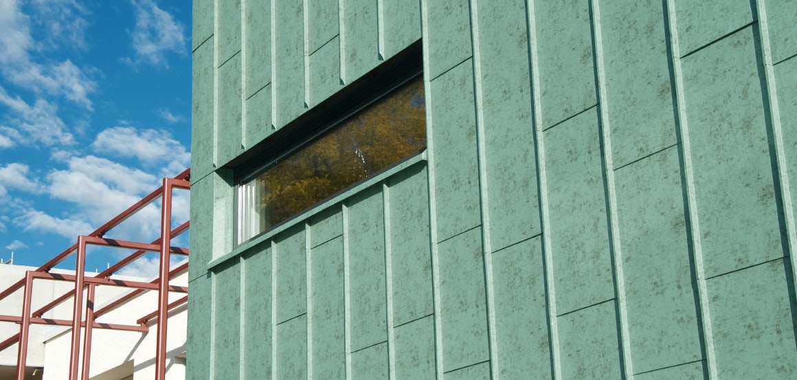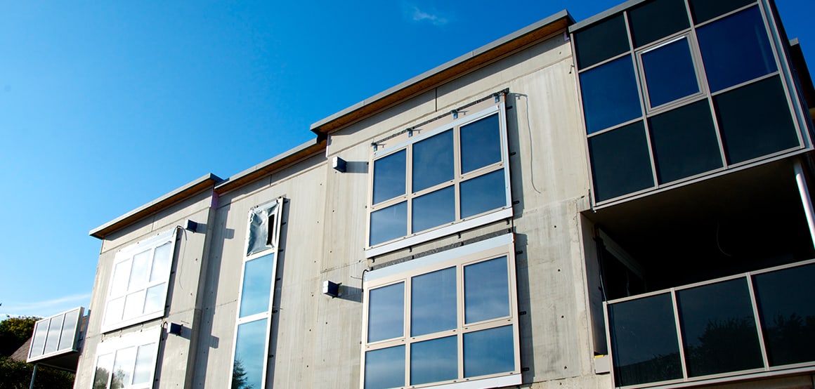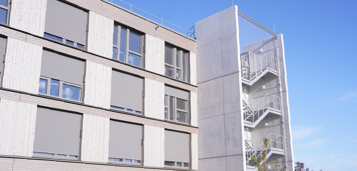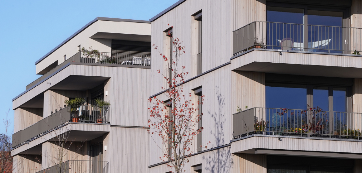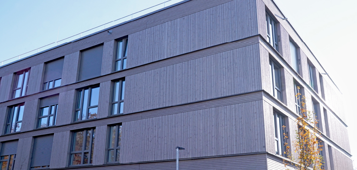 Hybridbauweise mit einem Stahlbetonkern und hybriden Holzfassadenelementen.
