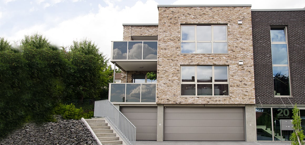 Stahlbetonholwände als Innenschale und vorgesetzte Klinkerwand als Außenschale. Bau der Außenanlage, wie Zuwege, Pflasterarbeiten und Zufahrtsbereich zur Tiefgarage. Fassade / Klinker, Perfekte Wärmedämmung durch zweischaliges System.