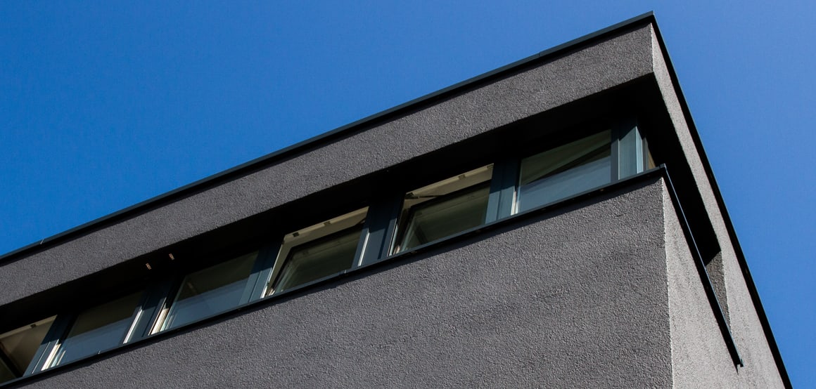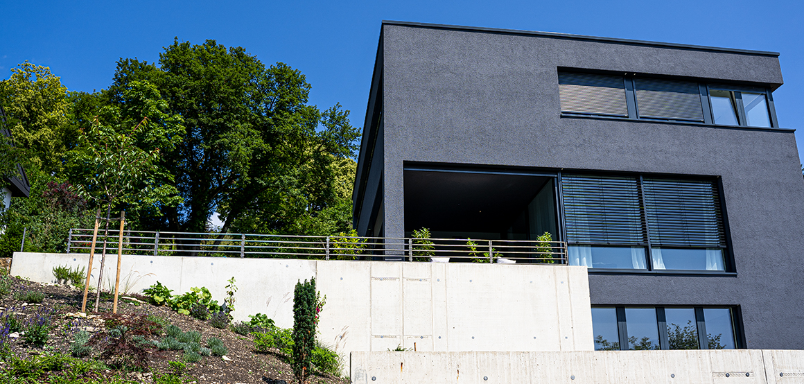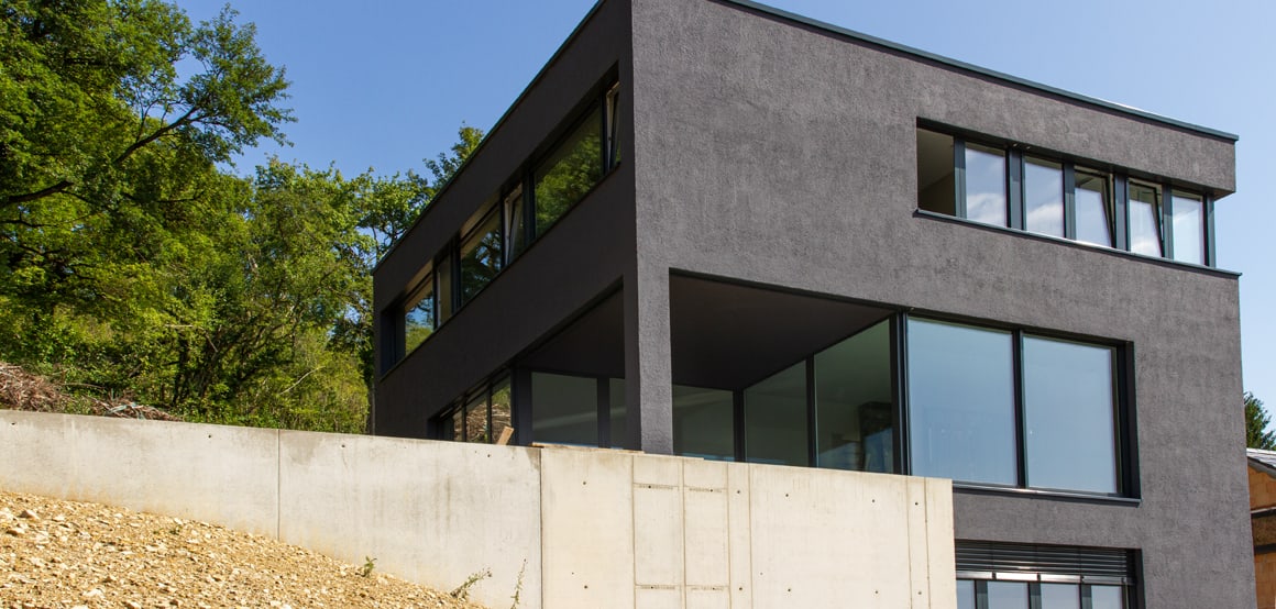 Der Schwarze Kubus aus Stahlbeton-Terassen-Wänden wurde in einer Mischung aus Stahlbeton und klassischer Ziegelbauweise errichtet. Die verwendeten Hochlochziegel der Ziegelwerke Bellenberg sorgen sowohl für ein angenehmes Raumklima als auch für die die Wirtschaftlichkeit des Wohnhauses.